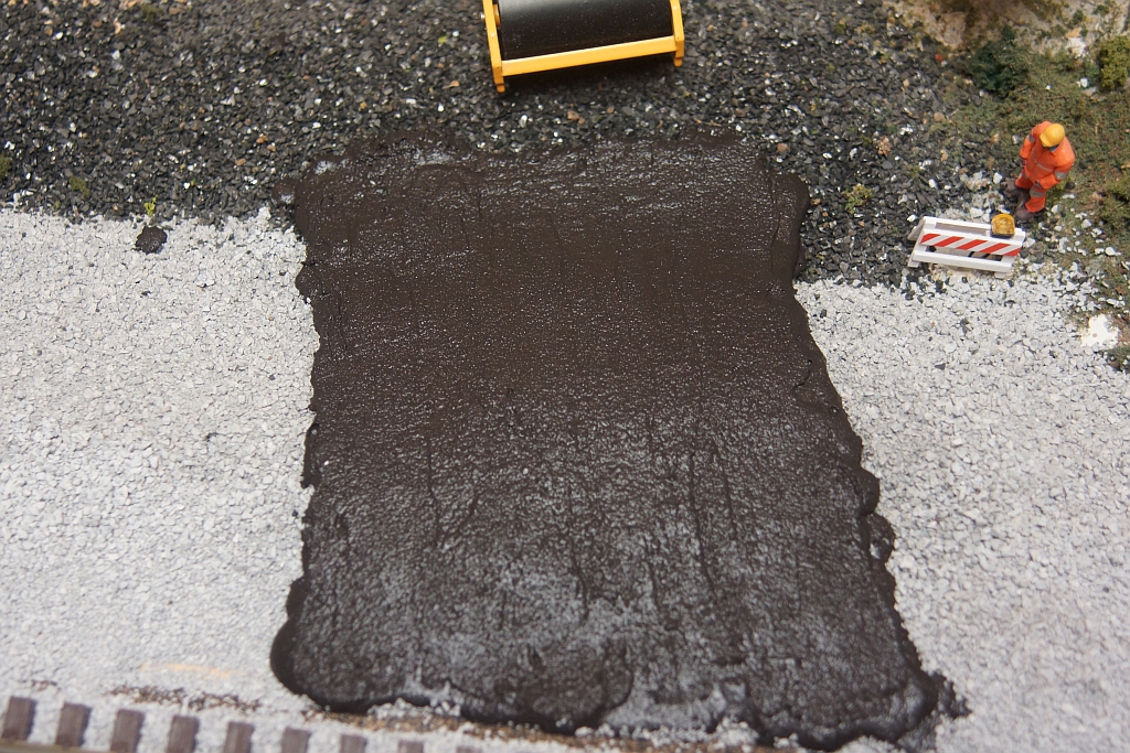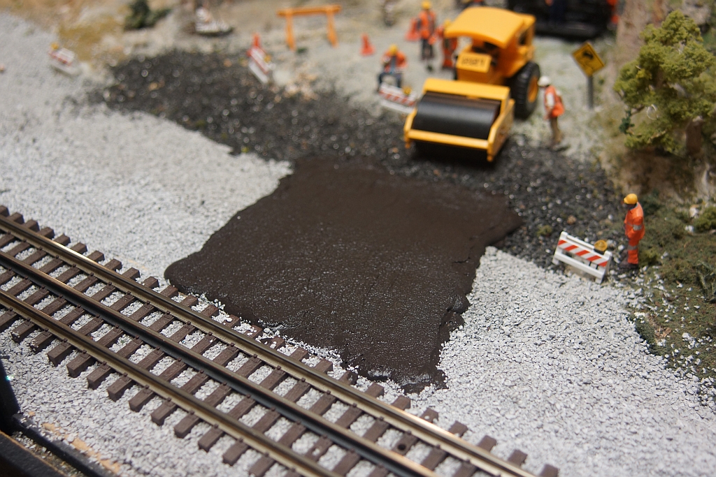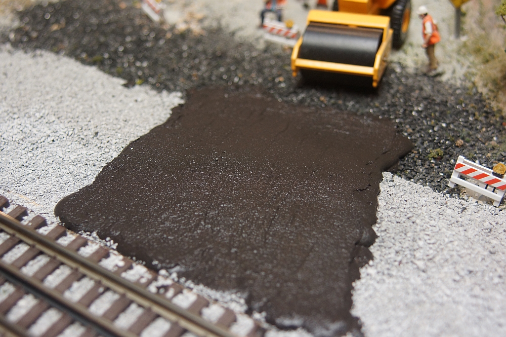 - Hobby Lobby product is more of a dark brown than black. A light weathering will tint the road to your chosen prototype. Mine shown here is a freshly paved road, so it'll get some black paint, after I add new road crossings to the track, and build the road up to that level.
