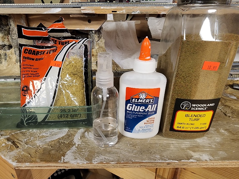 Thinned 50/50 Elmer's Glue-All to water, is dripped over the wetted decomposed granite, and then the light blended turf is sprinkled onto the wet scenery. The materials will soak up some the of glue and stick.