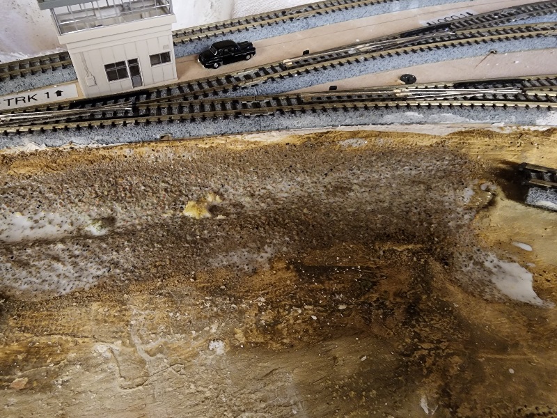 Basic hardshell scenery techniques were used to make the scenery base. Plaster cloth over cardboard strip, was then painted with Woodland Scenics earth brown undercoat paint, thinned 25/75 paint-to-water.