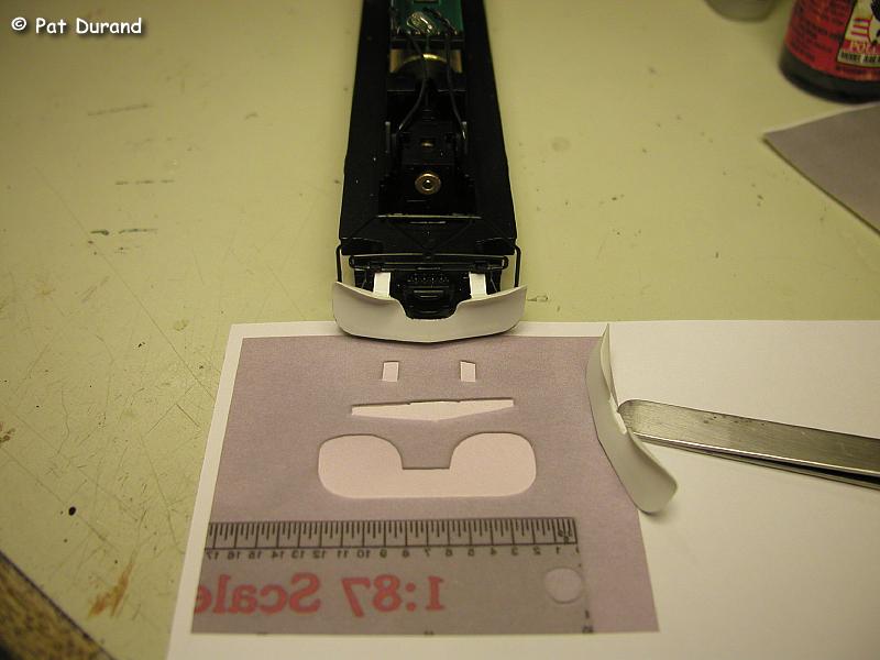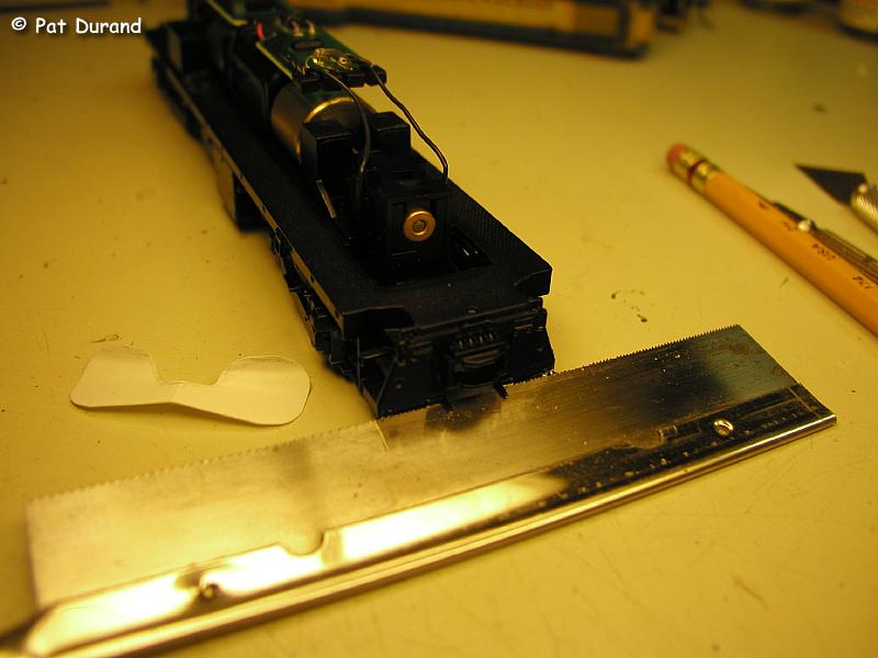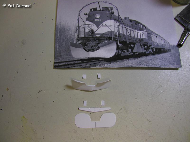 If the loco you are using has foot boards, modify them so the base plate for the plow can be fitted to sit on top of the foot boards.  Use at least 1/16" styrene for the base plate.  On the Atlas RS1,  I notch the foot board bracket and trial fit the base plate.  Before attaching the plow to the base plate, make a light scribe line at the vertical center line on the back side of the plow to facilitate a nice sharp bend at the point of the plow. Now angle file the lead edge of the base plate for a good fit to the back of the plow and join the two pieces with Testors Liquid plastic cement.  Mate these parts so the bottom of the plow will come just below the bottom edge of the old foot boards.  Let that assembly cure overnight.
