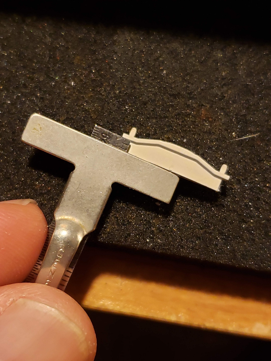 The bolster from shelf to floor, was 11/64th of an inch tall. I cut this down with a file to 1/16th of an inch. Using a slide rule I measured it over and over to make sure it was even