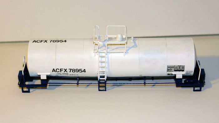 For the Atlas ACFX Kaolin tank car, I had to do much more work. The car I started with was decorated for Thele Kaolin, white with a black bottom. I used the time honored practice of using a small bit of sand paper, in my case a sanding stick, to sand off the reporting marks, road numbers, and Thele logos.