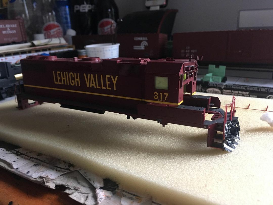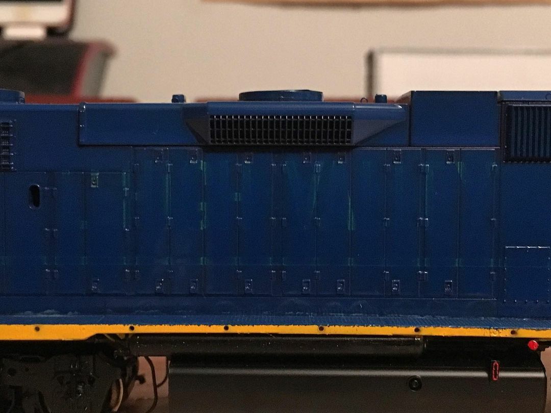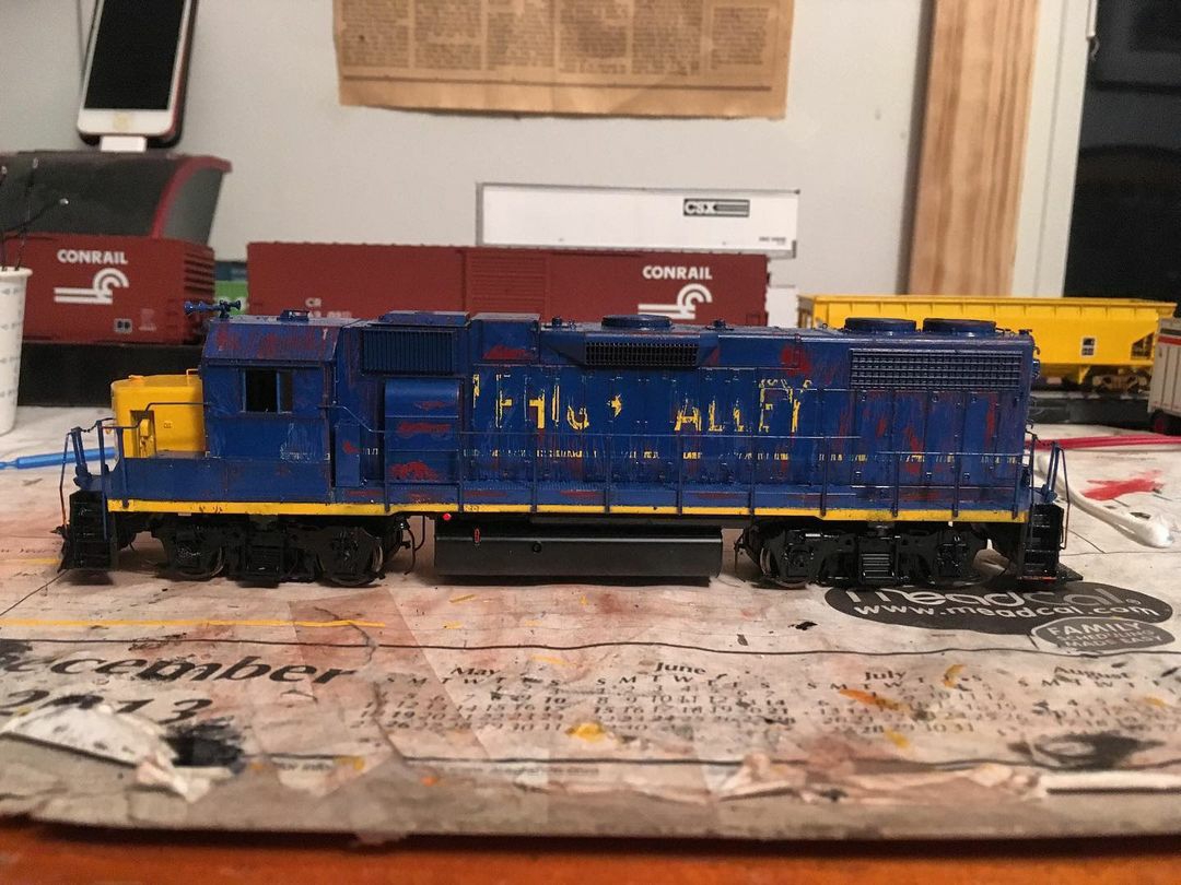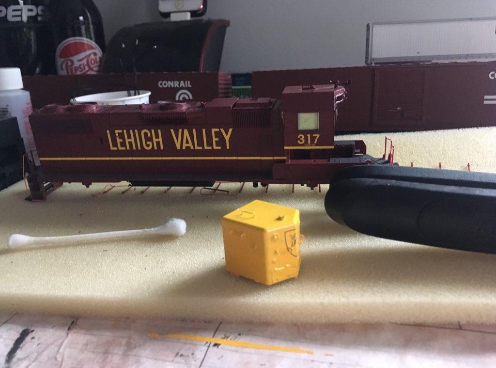 Step 1: Joe began with a factory decorated Lehigh Valley GP38-2. He torn the unit down to it's bare shell, removing any details he did not want to paint blue. This included separating the shell from the chassis, removing the cab to remove the windows and interior. Joe also removed the handrails, as they would be in the way for later work.