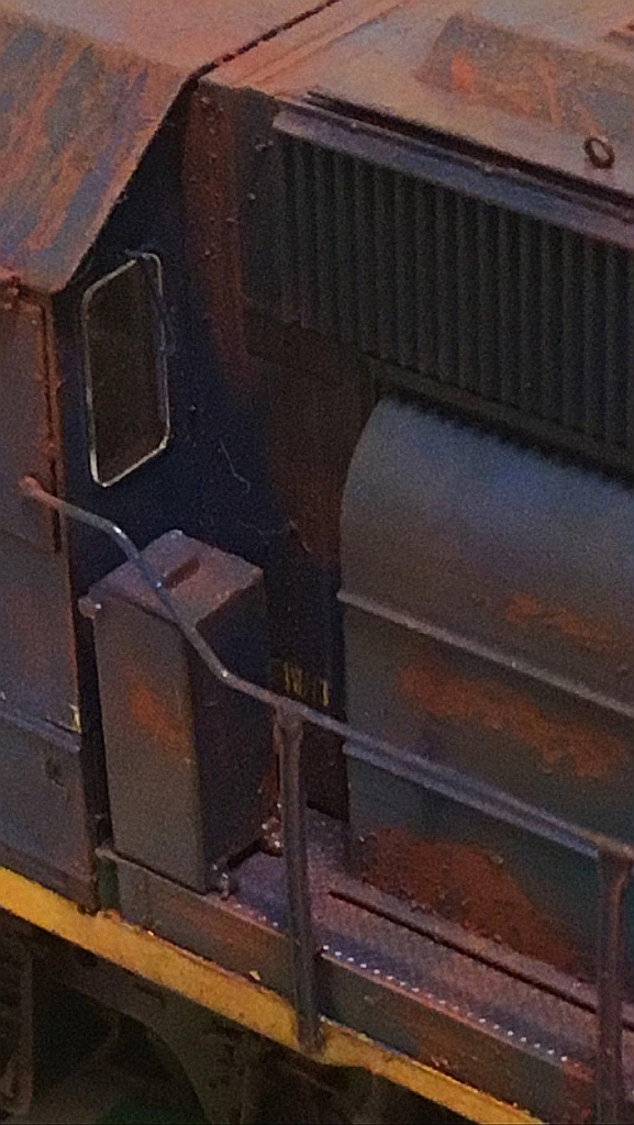 Step 7: Joe used various shades of pastel weathering powders to enhance the aged look of the locomotive. In addition to the heavy blue paint peeling, the unit acquired lots of road grime, and more subtle paint wear.