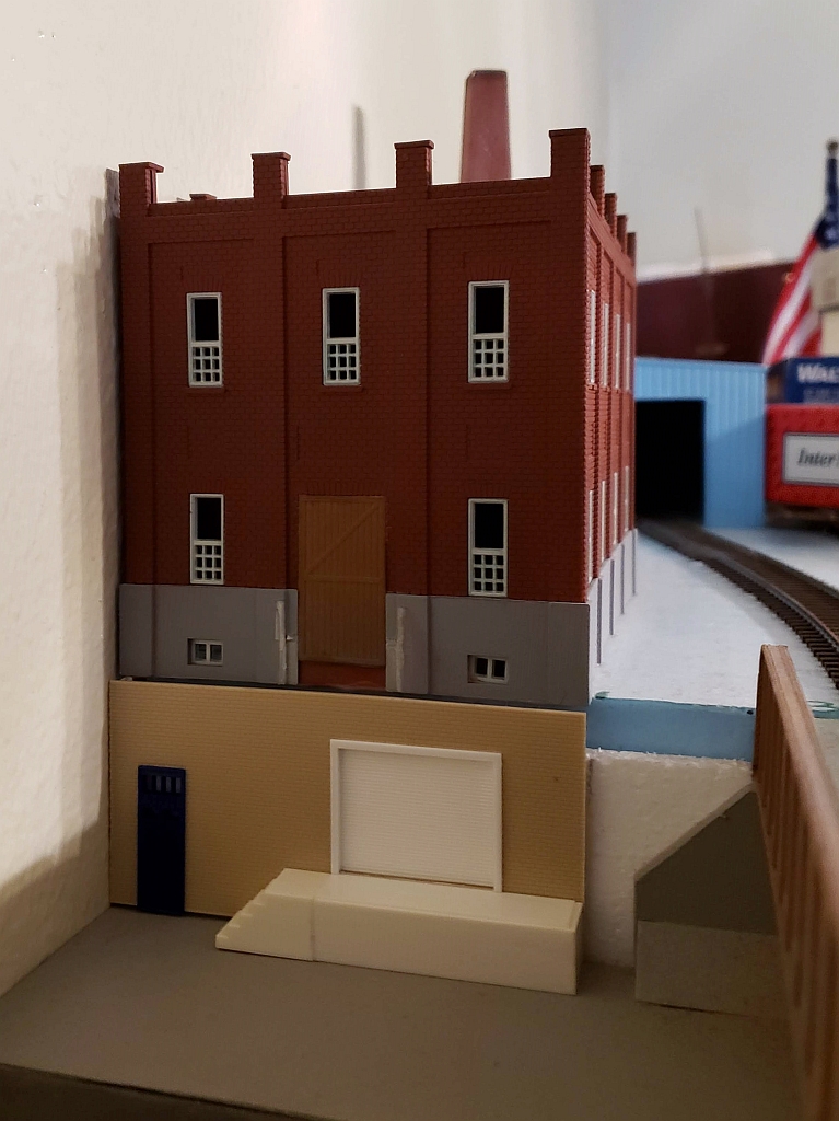 The Factory is represented by a mix of RDA, Walthers, and Pikestuff kits, and sits at track level, but there are doors to the "basement" located at street level on both streets I modeled. So, I needed to scratch build a basement wall, complete with loading dock, roll up door, and personnel door.