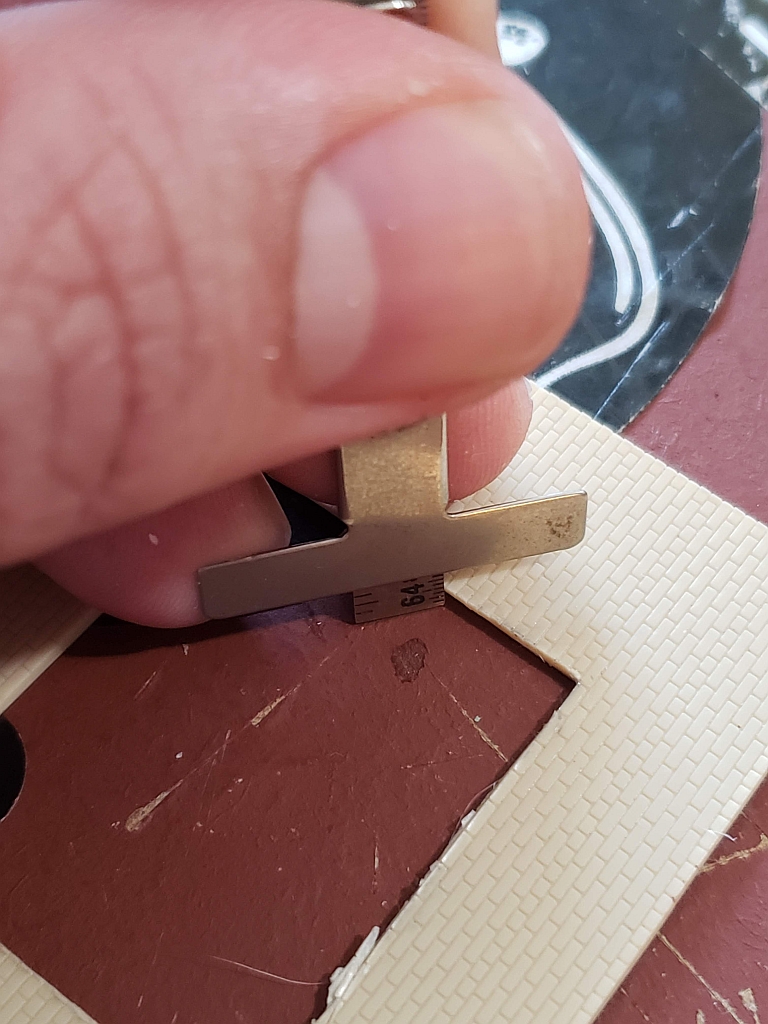 The loading dock and roll up door come from a Pikestuff Kit. I assembled the dock, then sized it up to the wall, marking the height on a row of bricks. I then measured and marked the wall for the hole to fit the roll up door. I cut the opening with a sharp blade, and use a file to finish the opening to the right size.