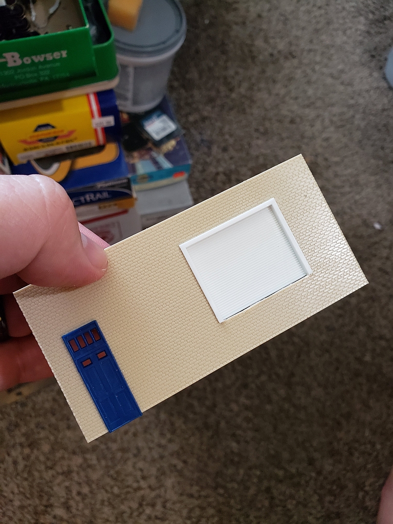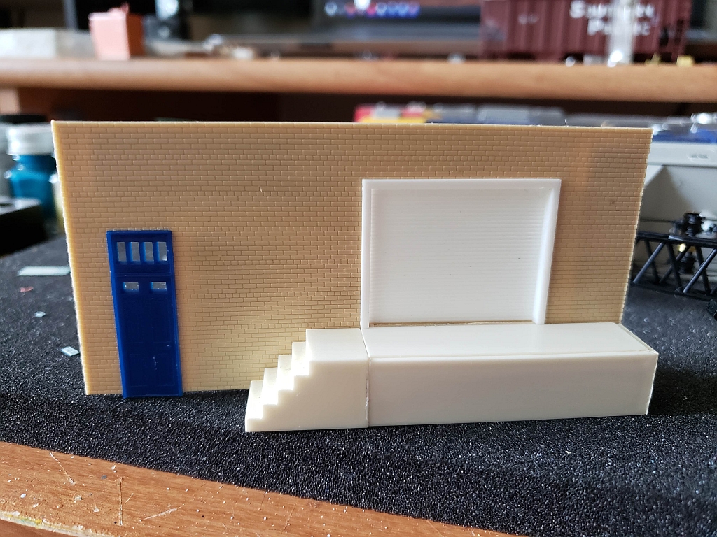 Loading dock test fit on the module. You can see the old boarded up street level door, which has not been used since the street underpass was built. That door also came from my scrap box! Once I complete some scenery on the exposed white Styrofoam, I'll permanently install this scratch built wall.