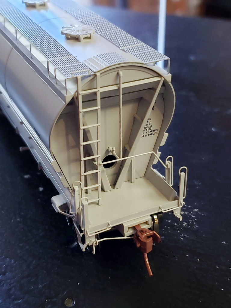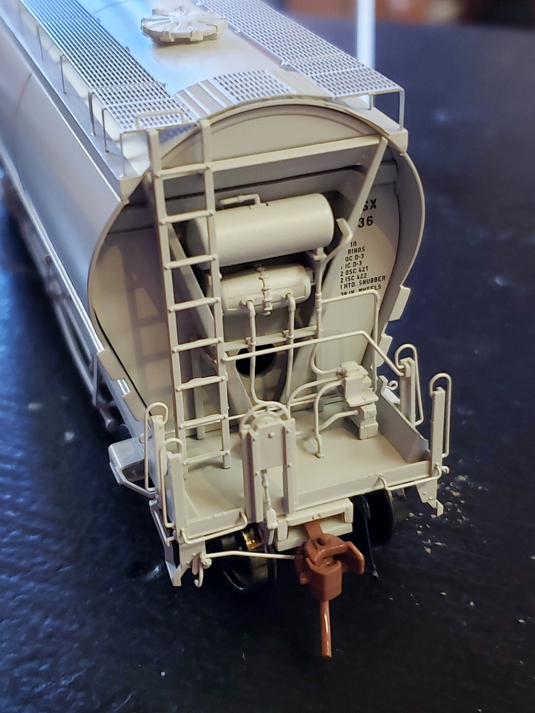 End details were another stopping point for my old AHM kitbash.  These cars had two air reservoirs, used for both air brakes and for the pressure system to help unload the cars.  In addition to that, there were cool stand off grabs, completely looped at the top of a hard stanchion on each corner of the car.  Hand bending that grab was a daunting task I never accomplished.