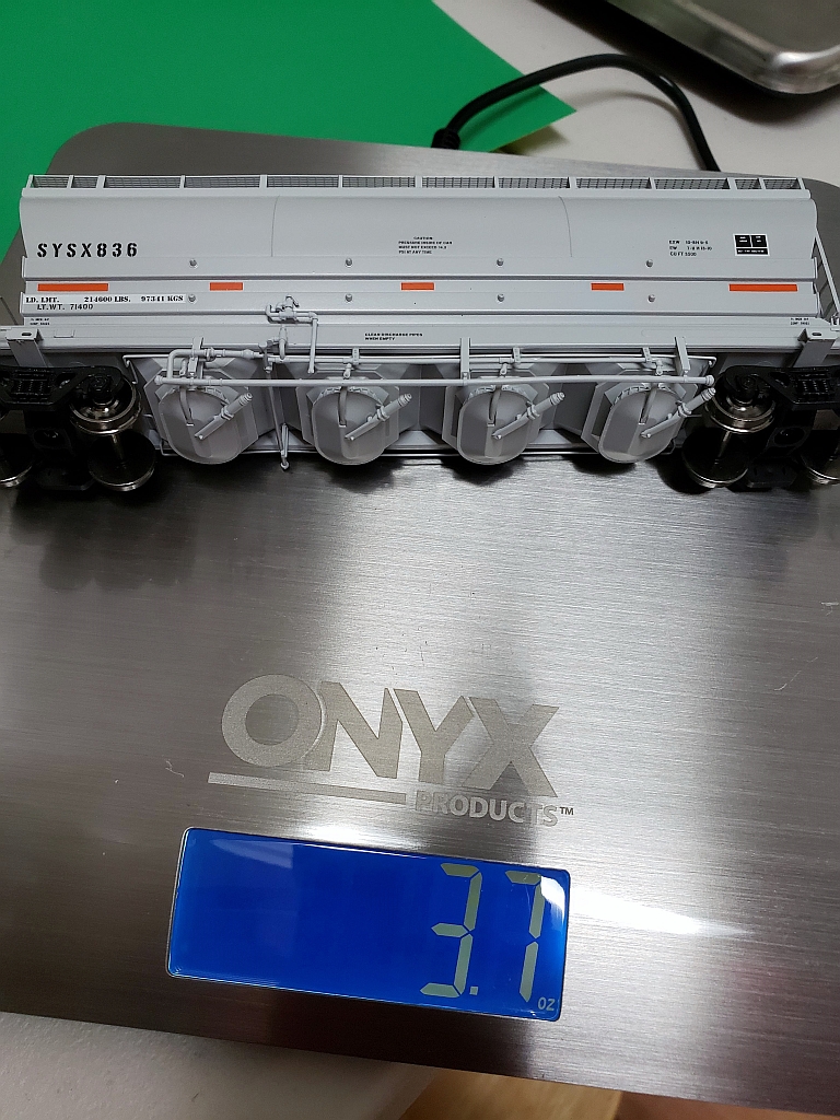 Being an enclosed car, one expects the model to closely conform to NMRA recommended practice 20.1 regarding car weight.  As you can see the car weighs in at 3.7oz.  Simple measurement of the car shows it is 6.25" long, meaning the car should weigh 4.2 oz to be in compliance with NMRA RP-20.1.  This car should perform well on well laid HO scale track, but being underweight it may cause issues on some less than perfect layouts.