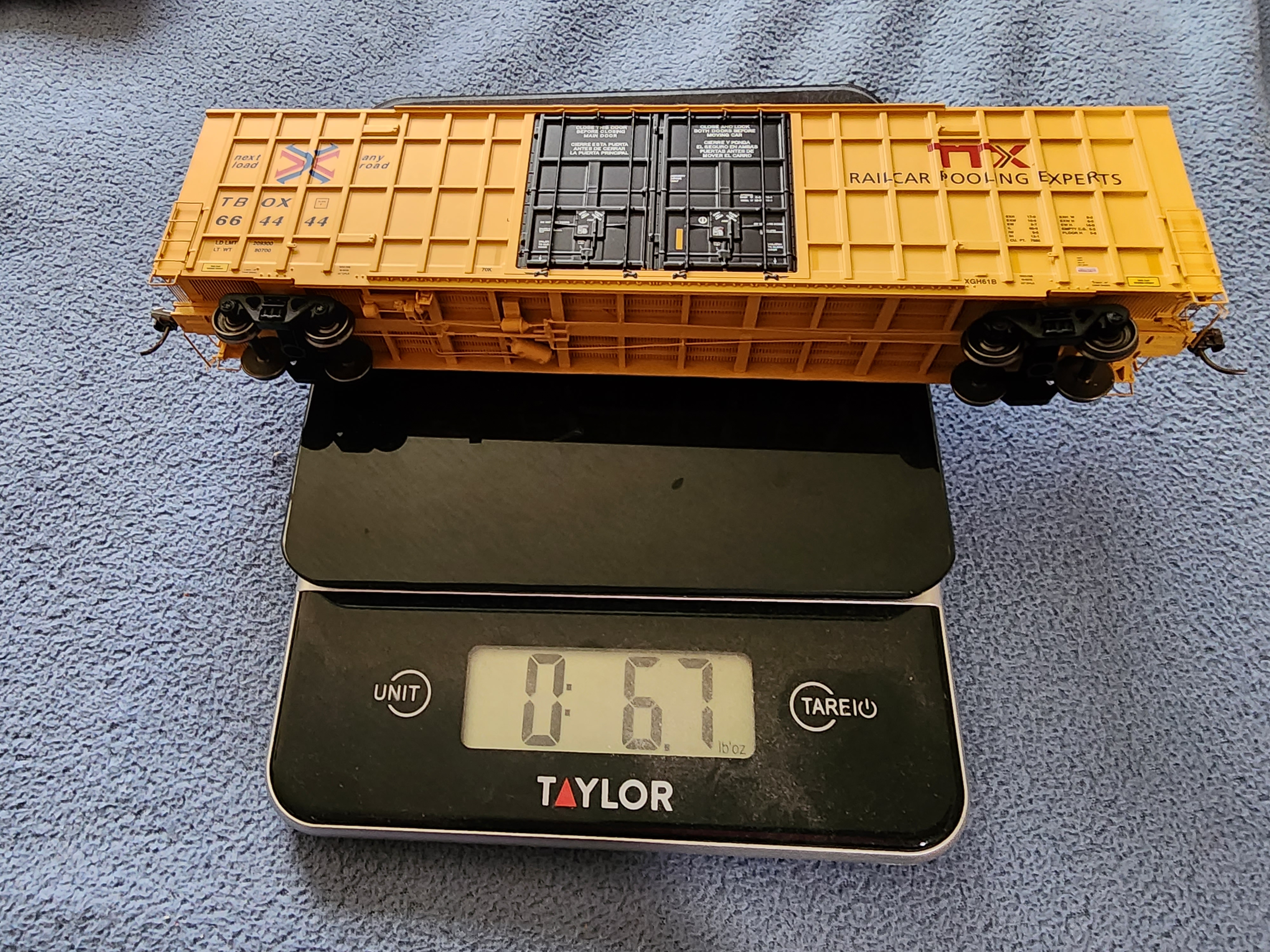 Weight is over per NMRA recommended practice. The car should be 5.25oz, but you can see it's 6.8oz! I'd still rather a slight overage like this, than under, especially for any enclosed car.