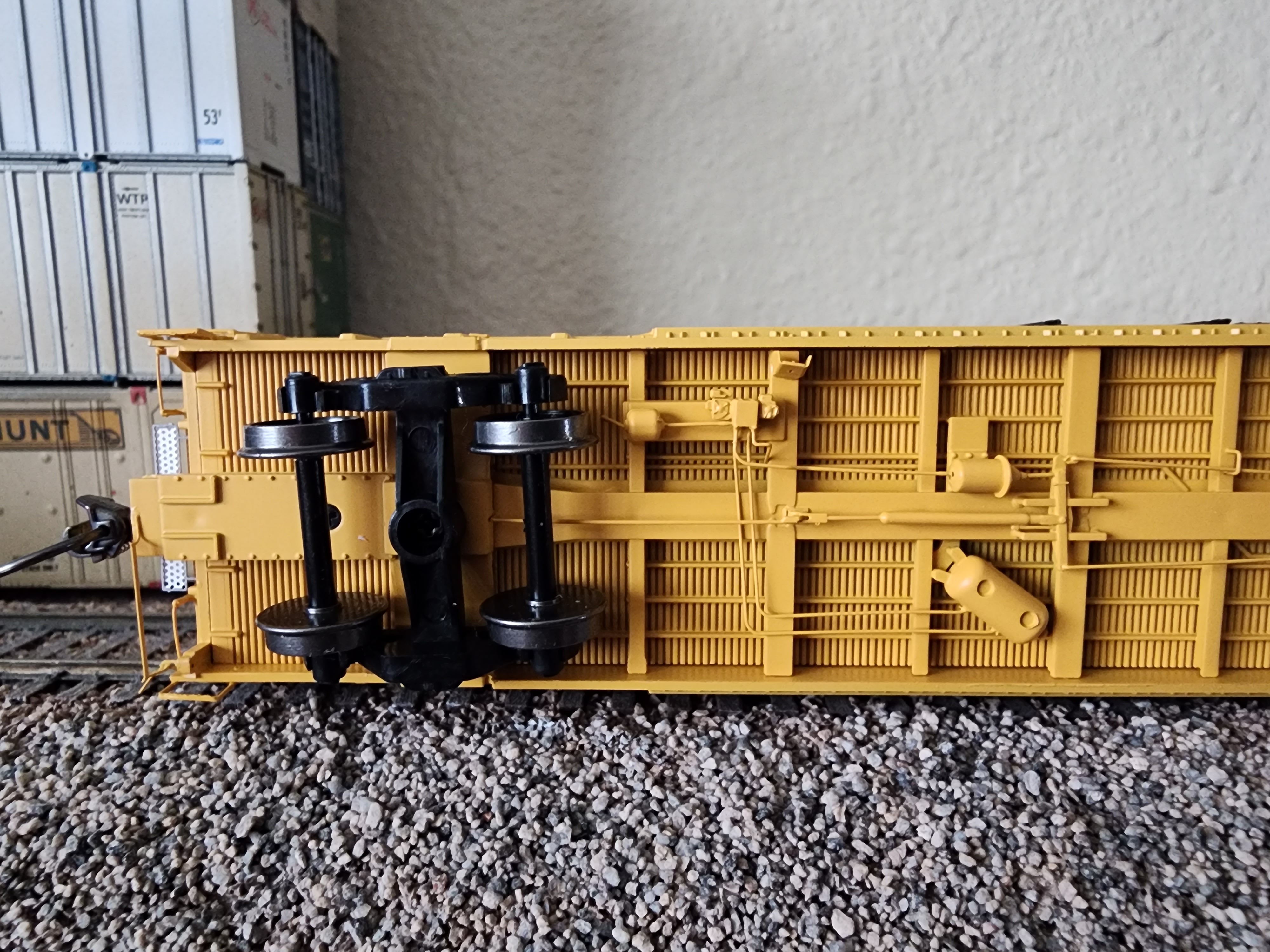 Wheels are in gauge and my model has all 36" per the prototype. Kadee couplers are installed, but droop to be in standard (i.e. they're high, but drooping to standard gauge height).