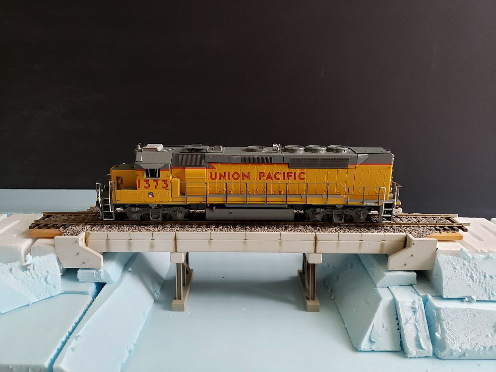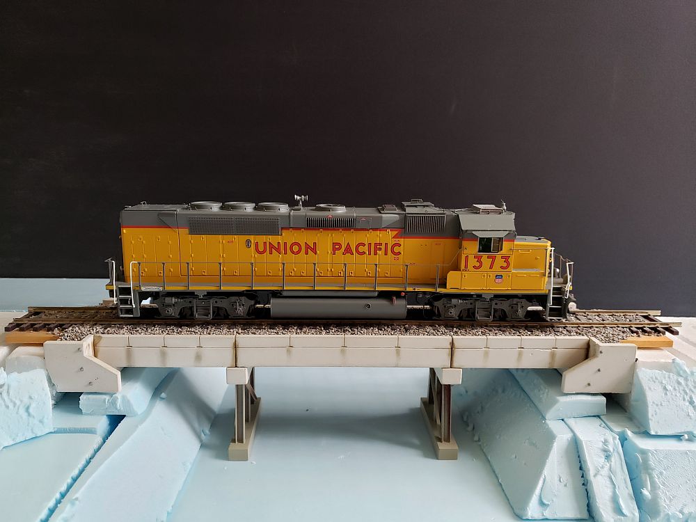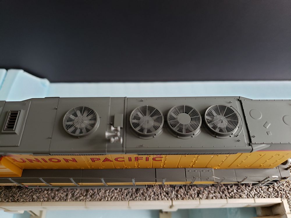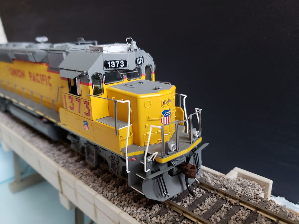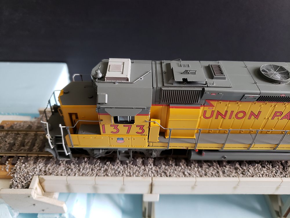 I recently acquired this incredible GP40P-2 model from Athearn Genesis. Athearn has been striving for detail and matching road number detail for detail. These GP40P-2's were built for Southern Pacific with their usual light cluster. It was repainted at least once in Southern Pacific hands, and later into Union Pacific paint after the merger. #1373 models a unit in Union Pacific paint, with a lightning stripe on the hood, thus effectively dating this as a contemporary model.