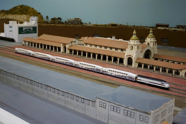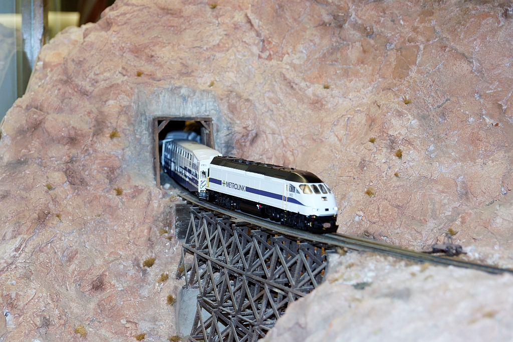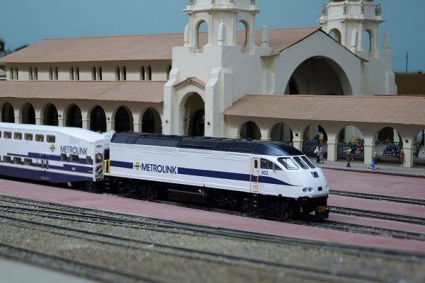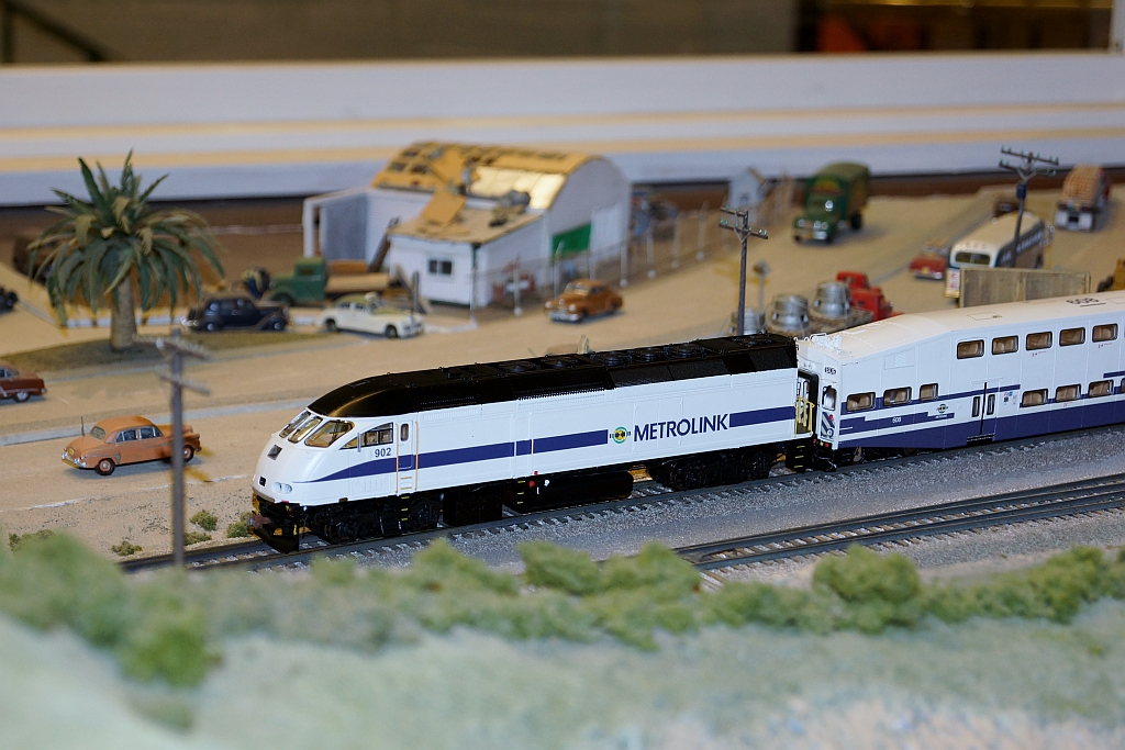 The San Diego Model Railroad Association was courteous enough to allow me to stop by on their monthly Sunday operating session/museum duty day. Prior to the the Model Railroad Museum opening, I was able to set up from the outside (visitor isles) to photograph the locomotive and Athearn Bombardier commuter cars at their model of the San Diego Santa Fe Depot.