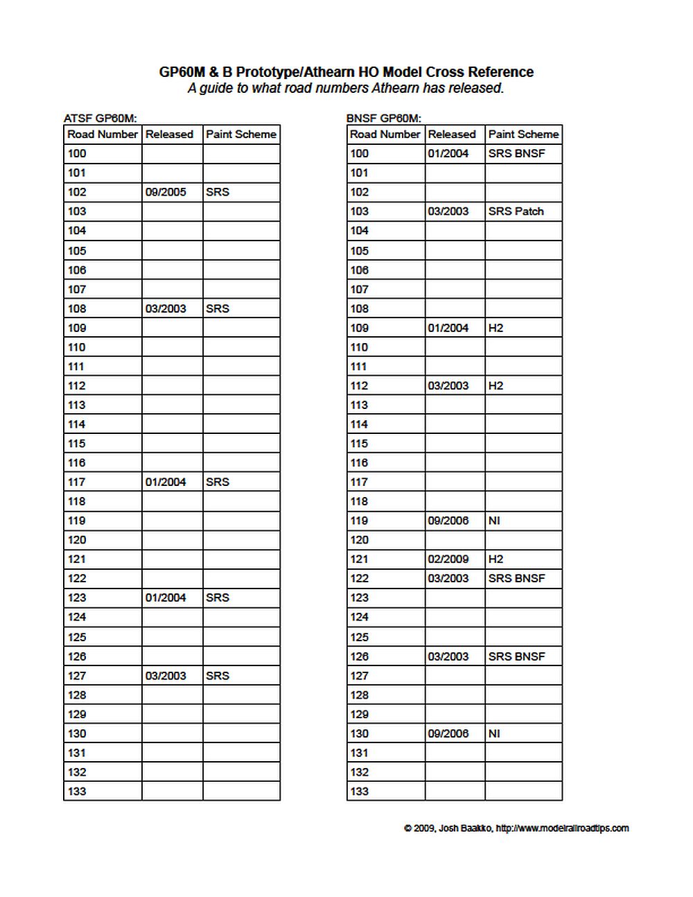 GP60M & B Prototype/Athearn HO Model Cross Reference