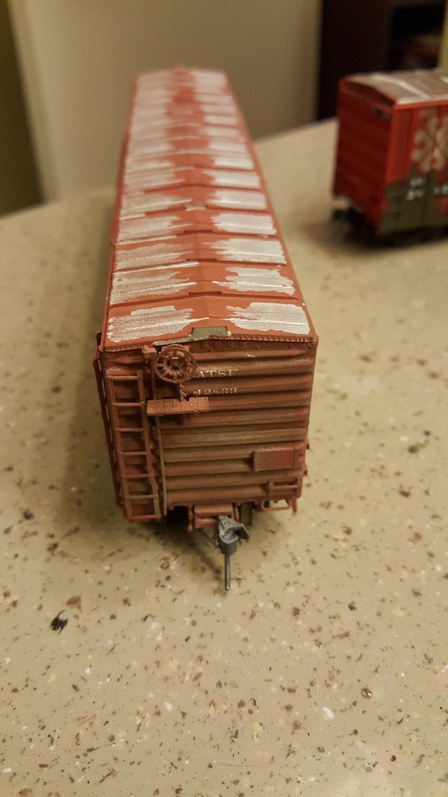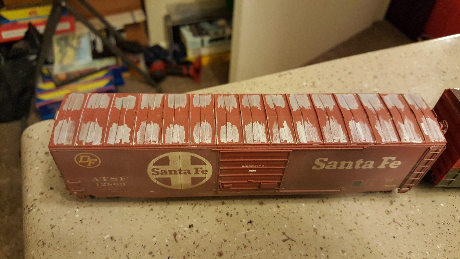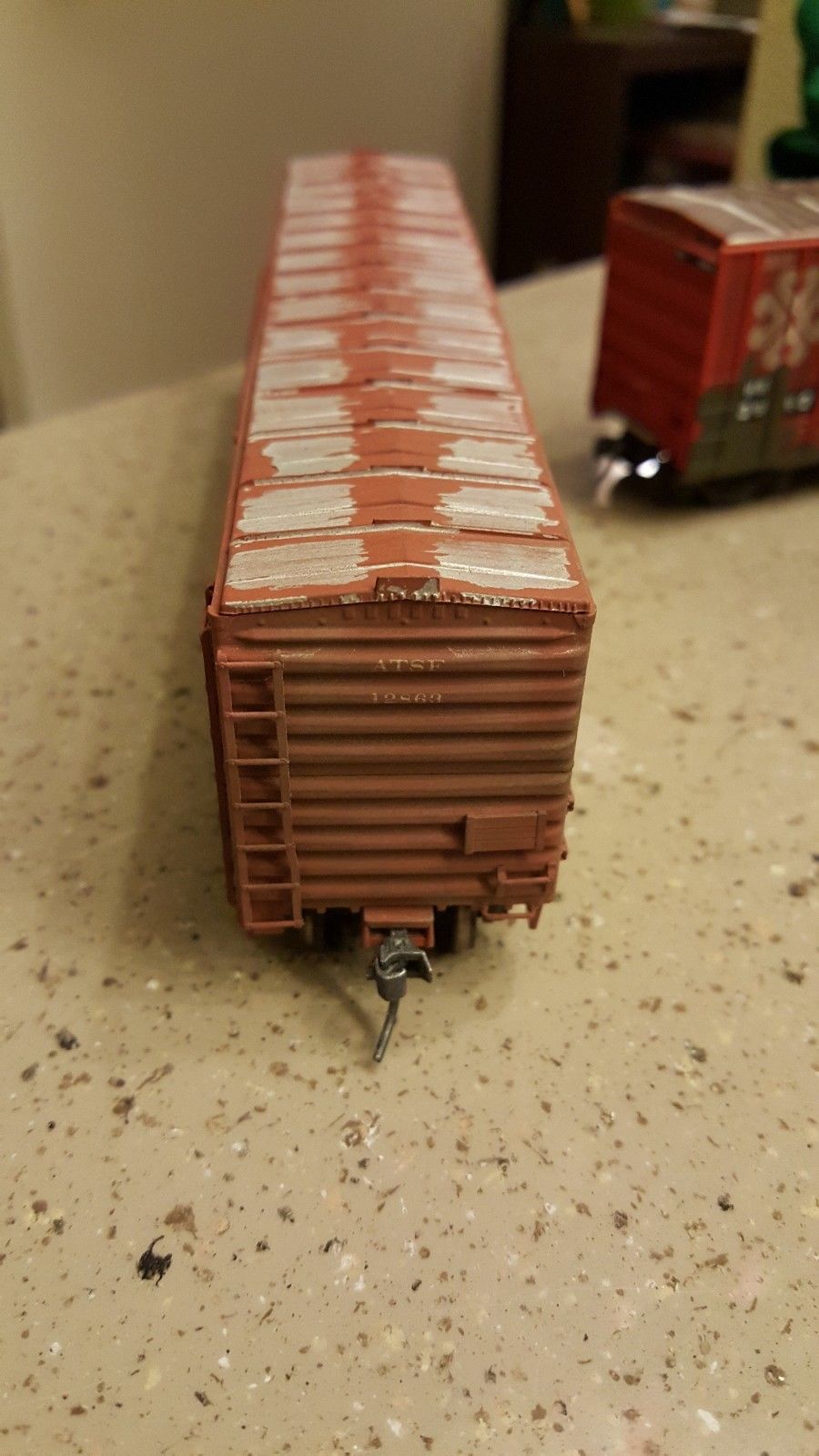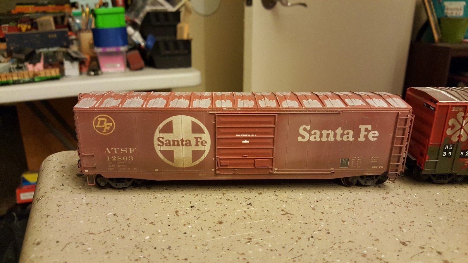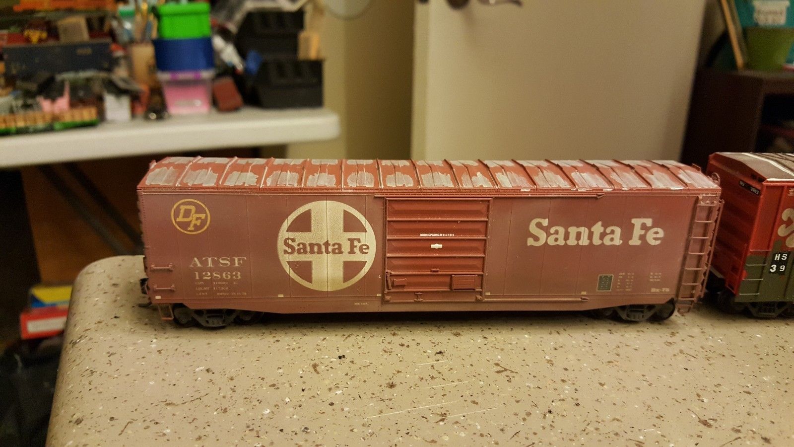 Don't miss a chance for a freight car with a one of a kind chipped roof exposing the galvanized steel roof under Santa Fe's paint job.