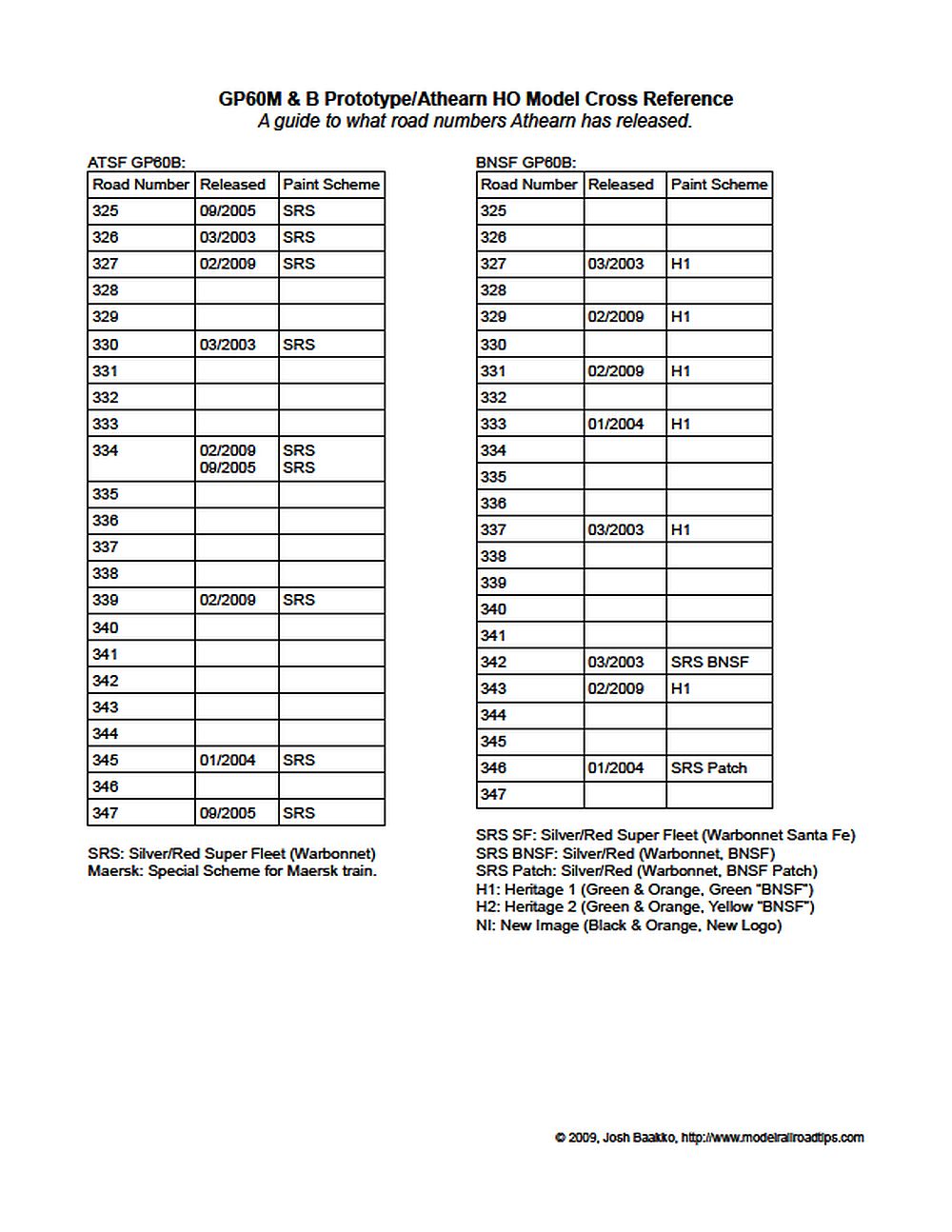 GP60M & B Prototype/Athearn HO Model Cross Reference