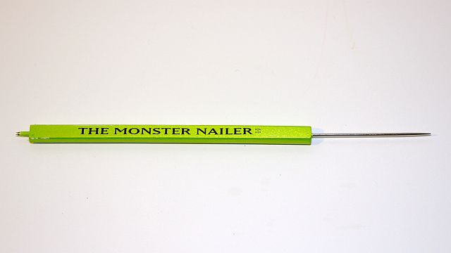$10... What a deal! The Monster Nailer is a simple tool, with two sharp points at one end, and a single point at the other. It's advertised as a tool to add nail holes & knot holes to wood kits, such as craftsman structure kits. It can also be used as a glue applicator.