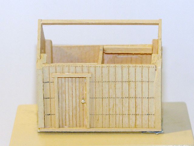 I simply penciled on a line, then used the two hole end to poke some indentations into the siding. I then assembled the kit, and sprayed it with Model Master Light Ivory.