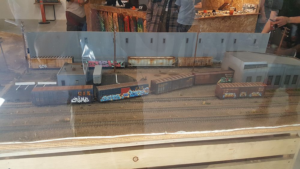 This was a full HO scale module display with weathered and graffiti boxcars.