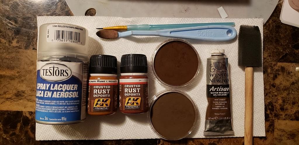 For the next step you'll need your soft medium brush and the AK interactive medium crusted rust. This is where you are gonna put a good amount on your brush, applying it to every spot you want rust to be. This is what I would consider your rust map or outline. The reason I say this is because with the next paint, you will apply it just up to the edge of this lighter color. You might notice some inconsistencies in this first layer but do not worry, the next layer will cover most of this first layer. Using either a white spirit or paint thinner, clean your brush off.