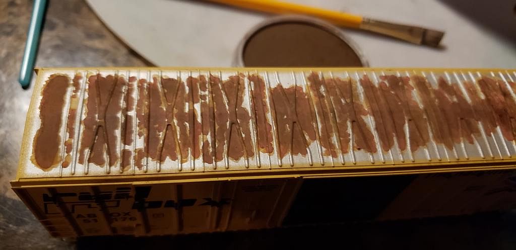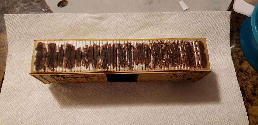 On to the final few steps. You will need your oil paint and artist sponge. Applying a little amount to the corner of the sponge, you will apply it to the darker spots of the roof. Once oil is on the car, use the clean corner of the sponge to dab it down so that you have a nice thin coverage. The oil will be shinny but the next step will dull it down. Once you have finished applying the oil paint to the desired areas and let it dry for 10 minutes, you will be on to the final step. For this you will need the pastel red iron oxide and the make-up sponge. Using the same technique as before dab it in an up and down motion into the oil paint. Blowing or softly brushing off any extra pastel that may be left over. Seal this all in with a final coat of dullcoat and you'll be finished. Remember the L&L method. Layers & less is more!