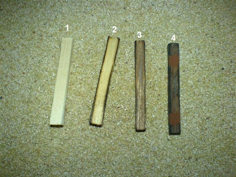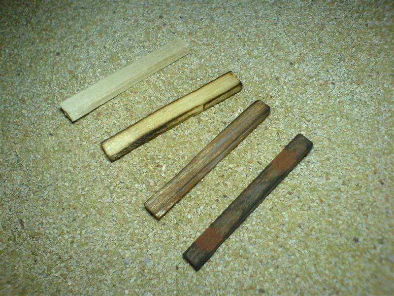 Now that you've sliced some ties, its time to light them up. Remember, this step IS NOT to be attempted by children with out adult supervision! Pick up a tie with your tweezers or needle nose pliers. Using the grill lighter, carefully burn the end of the tie thats exposed. The point is not to light the tie on fire, but rather burn off small strands of wood, and get the edges and corners to blacken. Now flip the tie around & repeat. See tie #2 above. This step can be skipped, and the black chalks in the next step can do the blackening of the edges.