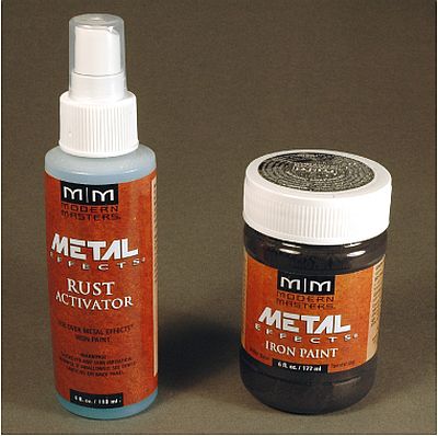 Although it is possible to create the appearance of rust by using paints, chalks and other weathering materials, I discovered another way to do so during a visit to a paint store a few years ago. Located among faux finish paint products made by Modern Masters, I discovered a product called Metal Effects Iron Paint and Rust Activator.